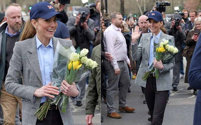 Vương phi Kate vẫy chào và nhận hoa từ người hâm mộ khi tham gia sự kiện cùng chồng, Thái tử William, dọc bờ sông Thames tại London hôm 12/3. Ảnh: GC Images